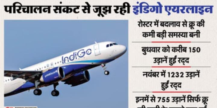 मीडिया रिपोर्ट्स के अनुसार, पहले ए320 एयरबस विमानों में सॉफ्टवेयर अपडेट की समस्या और अब डीजीसीए के एफडीटीएल नियमों को लागू करने की वजह से इंडिगो का परिचालन बुरी तरह से प्रभावित रहा। यही वजह रही कि नवंबर माह में इंडिगो की 1232 उड़ानें रद्द हुईं, जिनमें से 755 उड़ानें सिर्फ क्रू की कमी के चलते रद्द हुईं। एटीसी सिस्टम फेल होने की वजह से 92, एयरपोर्ट एयरस्पेस पर प्रतिबंधों के चलते 258 और अन्य कारणों से 127 उड़ानें रद्द हुईं।