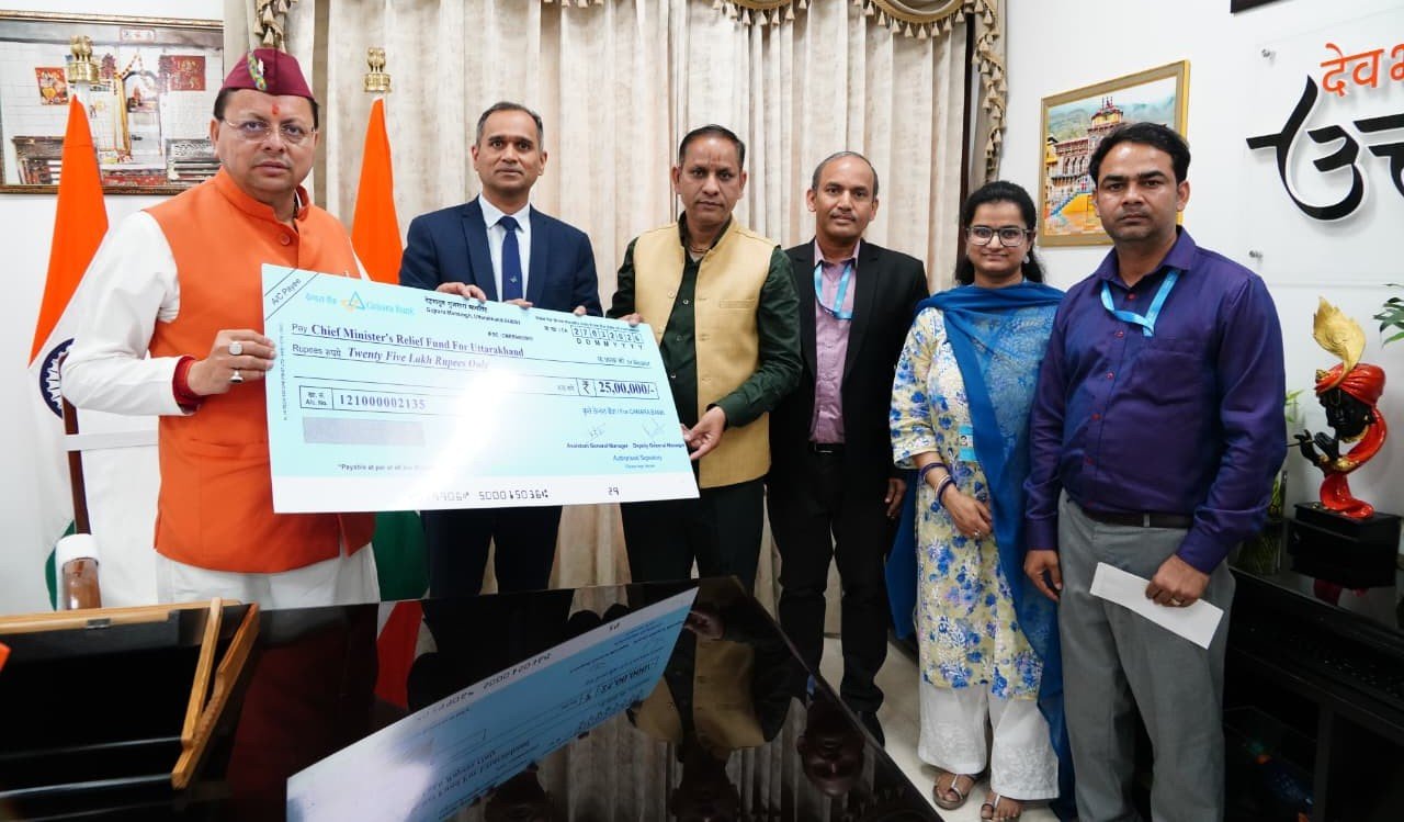 देहरादून में मुख्यमंत्री पुष्कर सिंह धामी से मुख्यमंत्री आवास में केनरा बैंक के प्रतिनिधिमंडल ने शिष्टाचार भेंट की। इस अवसर पर बैंक की ओर से मुख्यमंत्री राहत कोष के लिए 25 लाख रुपये की धनराशि का चेक भेंट किया गया। मुख्यमंत्री ने इस सहयोग के लिए केनरा बैंक का आभार व्यक्त करते हुए कहा कि मुख्यमंत्री राहत कोष आपदा, दुर्घटना एवं अन्य आपात स्थितियों में प्रभावित लोगों की सहायता के लिए अत्यंत महत्वपूर्ण माध्यम है। उन्होंने कहा कि इस प्रकार का सहयोग समाज के प्रति संवेदनशीलता और जिम्मेदारी का परिचायक है, जो जरूरतमंदों तक समय पर सहायता पहुंचाने में सहायक सिद्ध होता है। मुख्यमंत्री ने आगे कहा कि राज्य सरकार जनहित के कार्यों के लिए निरंतर प्रतिबद्ध है और इस दिशा में विभिन्न संस्थाओं एवं संगठनों का सहयोग सराहनीय है। उन्होंने आशा व्यक्त की कि भविष्य में भी केनरा बैंक इसी प्रकार सामाजिक उत्तरदायित्व के तहत योगदान देता रहेगा। इस दौरान केनरा बैंक के उप महाप्रबंधक संगमेश पड़नाड सहित बैंक के अन्य अधिकारी भी उपस्थित रहे।